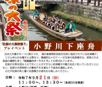 令和7年9月21日(日)11:00〜、13:30〜の2回(各回50分程度)、小野川(樋橋〜新橋)で下座舟が運航されます。 出演は大戸下座連で、雨天の場合は佐原町並み交流館にて演奏されます。 来…
