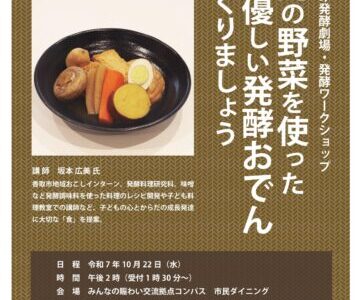 まちぐるみ発酵劇場・発酵ワークショップ 「地元の野菜を使った体に優しい発酵おでんをつくりましょう」が、令和7年10月22日(水) 午後2時から、みんなの賑わい交流拠点コンパス 市民ダイニングで…