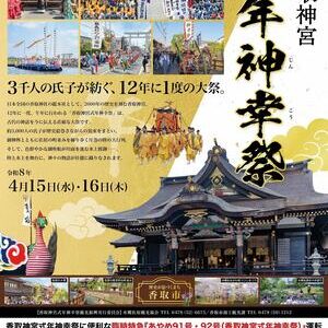 令和8年4月15日(水)16日(木)、香取市内で12年に一度の「香取神宮 式年神幸祭」が斎行されます。 この式年神幸祭は約800年の歴史を持ち、12年に一度の午年に行われる大祭です。 甲冑やお…